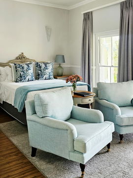 Located in the newer west wing, our three Luxury Rooms offer a calm, elegant retreat framed by views of the olive grove and Langeberg Mountains. Each space is designed for comfort and quiet indulgence — airy, light-filled, and thoughtfully appointed.