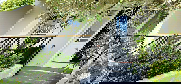 Two rooms feature extra-length Queen beds, while the third offers extra-length Twin beds that can be converted into a King on request. Every room includes both front and rear entrances, a private patio, and a spacious en-suite bathroom with a bath and a large walk-in shower.